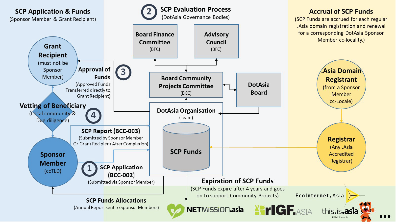 DotAsia is committed to its mandate of promoting Internet development and adoption in Asia Pacific. To dedicate a portion of the proceeds from .ASIA domain registry operations directly for community projects, the SCP process was put in place in 2008 upon the successful completion of the launch of the .ASIA Registry and structured to foster partnership with Sponsor Members of DotAsia. In 2024, discussions from the Advisory Council led to the development of the concept of a Common Pool of SCP Funds that can be utilized by any Member and the SCP program is extended to support projects sponsored by Sponsor Members as well as Co-Sponsor Members of DotAsia. This document describes the process for the application of funds for SCPs.
